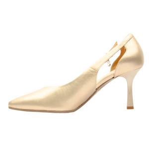 A classy ladies pointed toe court shoe from Bioeco crafted from soft and supple gold shimmering leather. Featuring cut out details to the sides and fastened by an adjustable buckle to the outside with a gemstone keychain for a touch of sparkle. Complete with a 80mm heel and lined in leather with a Softstep system footbed.