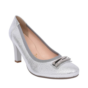 A classic ladies court shoe from Bioeco in a crackle effect silver leather complimented by a smooth silver heel counter.. Finished with a decorative brooch at the toe for added detail. With a super soft leather lining and a Softstep footbed offering cushioning and flexibility. 80mm heel