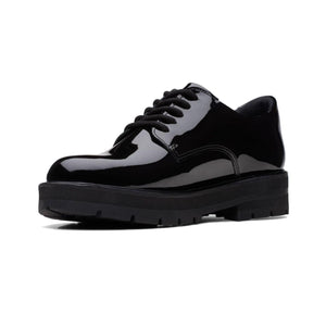 The Prague Lace youth shoe is a girls school shoe in black patent from Clarks. Featuring black patent upper and sporting a chunky rubber sole that is durable. Fastened with laces for a secure fit and lined with a comfortable foam textile footbed. These are the perfect youth school shoes!