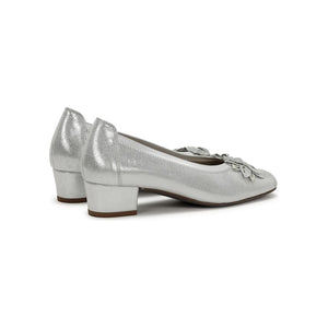Slip into a shiny silver shoe from Dorking from Fluchos. With a round toe and a low block heel. Featuring a high quality leather silver, with elasticated to make it a super comfortable fit. Finished with a flower design on the vamp.