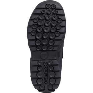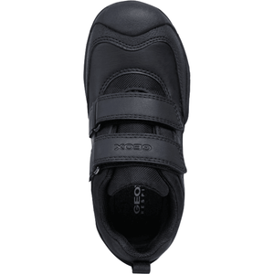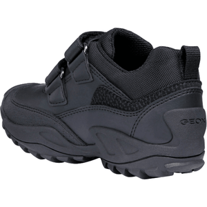 Savage is a sturdy boys school shoe from Geox, in a black leather and textile upper with a cleated sole and protective toe and heel bumper. Fastened with two velcro straps for a secure fit. Textile lined with the signature Geox perforated sole. This trainer features Geox's Amphibiox technology to make the trainer breathable and waterproof.