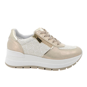 A classic shimmering gold casual trainer from Igi & Co for her. This comfortable fashion trainer is designed in a combination of leather and textile, in gold and white tones. Fastened with a side zip and laces to ensure the perfect fit. Finished with memory foam lining which is removable and a height of 55mm.