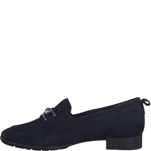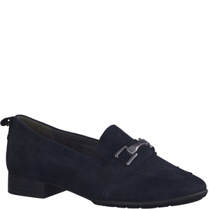 A classic ladies loafer from Tamaris which oozes comfort with its super cushioned Tamaris Comfort Fit leather insole which is removable if required. Finished in navy suede uppers in a slip on style with elasticated side gussets to secure the fit. Lined in suede and complete with a metal horsebit brooch over the toes and a pull tab to the rear with a slight 20mm block heel.