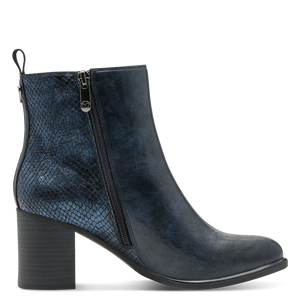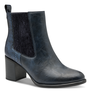 This stylish ankle boot from Marco Tozzi blends rich navy tones with textural contrast, including velvet-effect side panels and a soft reptile print at the heel. The block heel adds a feminine lift while keeping you stable on your feet, making this the ideal choice for dressier looks or elevating everyday outfits.