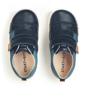 Playhouse is a sweet little boys shoe ideal for casual styling. In smooth navy leather uppers with a reinforced toe cap and heel counter for additional support, complemented by contrast stitching detail to the side. Featuring a padded collar in dark teal and fastened by two velcro straps with contrasting ends in tan and dark teal. Complete with a flexible sole unit and lined in leather with a leather footbed.