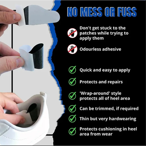 Self-adhesive Heel Hole Preventer patches offer a quick and easy solution to protect and repair heel holes in most types of footwear. These versatile patches can be trimmed to fit and feature a 'wrap-around' design for comprehensive heel protection. The thin yet durable material safeguards heel cushioning from wear and tear.