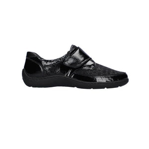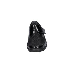 The Waldläufer Henni is a sleek and practical wide fitting shoe designed with both comfort and style in mind. Crafted in glossy black patent leather with a subtle textured finish, it offers a polished look suitable for everyday wear. The easy velcro strap ensures a secure fit, while the lightweight sole and cushioned insole provide all-day comfort. Perfect for pairing with both casual and smarter outfits, this shoe is a reliable wardrobe staple.