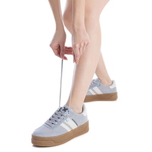 A stylish womens flatform trainer from XTI perfect for pairing with your favourite jeans and skirts. In a soft baby blue suedette complemented by white stripes to the side and a gum sole. Lace fastening with a soft textile lining