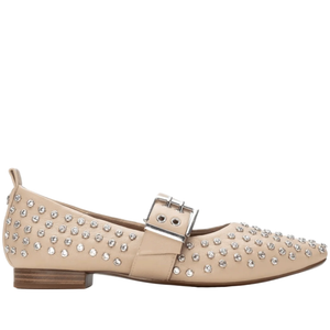 A chic and modern flat shoe that adds a touch of edge to any outfit. Designed in beige with all-over stud embellishments, it features a statement strap with buckle detailing and a pointed toe for a sleek silhouette. Perfect for pairing with jeans, skirts, or dresses for versatile styling.