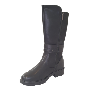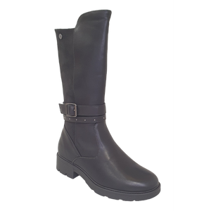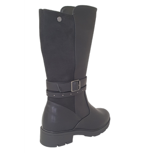A fashionable girls long leg boot from XTI, perfect for styling this upcoming winter. Featuring smooth synthetic leather uppers in black with a suedette panel to back of the leg with a wrap around buckle detail at the ankle adorned with studs for added edge. Lined in soft textile with a slightly cushioned footbed for comfort. Finished with a 30mm block heel.